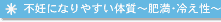| 肥満はホルモンのバランスを崩し、排卵障害を引き起こす可能性があります。また、冷え性による血行不順も同様。ホルモンの分泌量を減らし、排卵に悪影響を与えます。 |