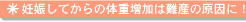 妊娠してからの体重の過剰な増加は、妊娠中毒症や糖尿病、分娩遷延などの難産の原因になります。体重が70kg以上の方、体重の増加が8kg以上になった方、あるいは近い将来必要以上の体重増加が予測されるお母さんにはスムーズなご出産を向かえるためにも、マタニティビクスやマタニティヨガ等に参加して体を動かすようにしましょう。産婦人科で栄養指導や無理のないダイエット食を推奨、教えてくれるところもあります。 |