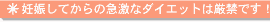 妊娠すると大切な命がお腹に宿ります。この小さな命はお母さんからの栄養を吸収して日々大きく育って行きます。こんな時にお母さんが無理なダイエットなどをすると、お腹の赤ちゃんに充分な栄養が行き届きません。妊娠してからの無理な、急激なダイエットは厳禁です!胎児に異常が起こらないよう、妊娠32週までに肥満と血糖コントロールが必要になります。ですので妊娠してから困らないようにするためにも、妊娠する前の計画的なスリミングがとても重要なのです。 |
