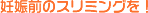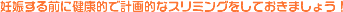 肥満防止が安産への第一歩です!これから赤ちゃんを作ろう!と計画されている女性はとくに、肥満体型を克服しておきましょう。妊娠・出産は思ったよりも体力が必要です。何よりも赤ちゃんがお腹の中で成長していきますので、ご自分の現在の体重と合わさって体重増加します。また、妊娠中毒症なども肥満が原因で起こりやすくなります。無理な、急激なダイエットではなく、美しく健康にスリミングすることが大切です。妊娠する前に計画的なスリミングを是非しておきましょう!