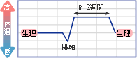 生理終了から排卵まで低体温の日が続き(低温期)、排卵を境に次回生理まで高体温の日が続きます(高温期)。低温期の最後に最低体温を示す日があります。これが、排卵日です。しかし実際に排卵日を言い当てるのは難しく、最低体温日の前後2日間を「排卵期」ととらえます。ホルモンが正常に働いている場合は、低温期と高温期がくっきり分かれ、このパターンを示します。 |