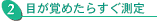 夜寝る前、枕元に体温計を準備。目が覚めたら、ふとんの中で安静にしたまま口の中に体温計を入れ、舌の下に軽くはさんで測ります。起きあがってしまうと体温が上昇するので、正確な基礎体温は把握できません。ただし、ふとんから出てしまった場合も参考までに測定してください。基礎体温表にも、その旨をメモしておきます。 |