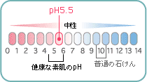 酸性、アルカリ性の度合いを0〜14の数字で表したのがpH(ペーハー)といいます。pH7のときが中性で、それより大きいときがアルカリ性、小さいと酸性です。皮膚を保護している皮脂膜は弱酸性のpH5.5なのです。 |