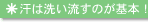 汗をかいてふやけた状態の皮膚も別の意味でバリア機能が壊れています。いろいろな水溶性物質の侵入を許してしまったり、皮膚の弱酸性が中和されてしまうので、殺菌能力が弱まってしまいます。また、時間がたって分解された汗は皮膚トラブルの原因になることもあります。しかし、汗の99%は水でその他が、脂肪酸や老廃物のアンモニアなどですから、洗浄力の強い石けんを使って洗う必要はなく、弱酸性の皮膚にやさしい洗浄料で洗い流すとよいでしょう。 |