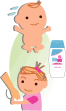 赤ちゃんは新陳代謝が活発で、毛穴と同じように汗腺の数も大人と同じです。そのため汗をよくかき、きれいに見えても肌は汚れています。また、プクプクとしたかわいい体型は関節やしわなどくびれたところがいっぱいあり、どうしてもそこに汚れが溜まりやすくなります。汚れが溜まるとあせもやかぶれができやすくなります。シャンプーもおかあさんはやわらかい赤ちゃんの頭を気遣い、きちんと洗わなかったり、すすぎを充分に行なわなかったりすることがあります。また、アルカリ石けんの場合、石けんカスが皮膚に残り刺激になる場合もあります。大人よりからだが温まりやすいので38〜39℃のぬるめのお湯を使いましょう。 |