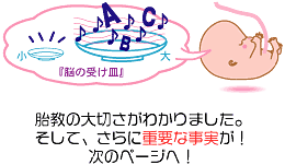| 『脳の受け皿』は生後6ヶ月までに決定してしまうという研究発表があります。例えば、英語のある発音を生後6ヶ月までに聞かなかった場合、それ以降はその発音に反応できない、ということがあるのです。「え!生後の6ヶ月間しかないの?」と思わないでくださいね。妊娠3ヶ月くらいから胎児の脳の中に記憶した痕跡のようなものが見られたりします。すなわち、お腹にいるときから赤ちゃんの脳は“受け皿の用意”をはじめているわけですから、お腹の中にいる時間も含めると十分『脳の受け皿』の用意をすることができます。 |