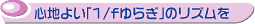 「1/fゆらぎ」とは、メトロノームの音とラジオの雑音の中間にあたり、規則正しさ と不規則さが調和している状態のこと。そよ風や小川の流れ、人の体もこのリズムで 動いています。クラシック音楽などにもこのリズムがあり、聴くと気持ちが落ち着く のはこのためです。