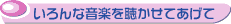 音楽は、赤ちゃんの脳の発達に最適。特に、情緒をつかさどる右脳を活性化させます。赤ちゃんはもちろん、お母さん自身が気持ちよく過ごすためにも、お気に入りの音楽を揃えておきましょう。 |
