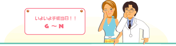 まず血圧や熱など、体調のチェック。風邪、ゲリ、ベンピなどがあれば告げてください。持参した生理用ショーツとナプキンを看護婦さんに渡します。このあと、麻酔中の呼吸をスムーズにするための注射があります。 |